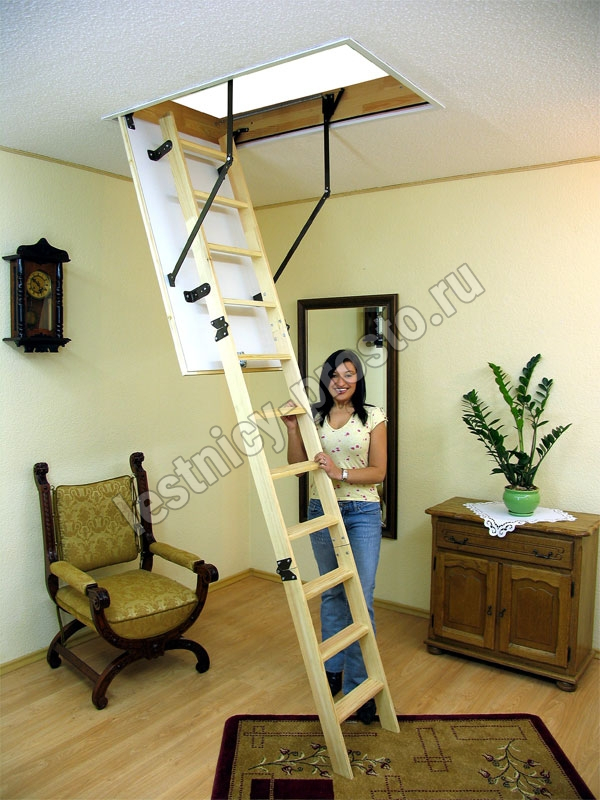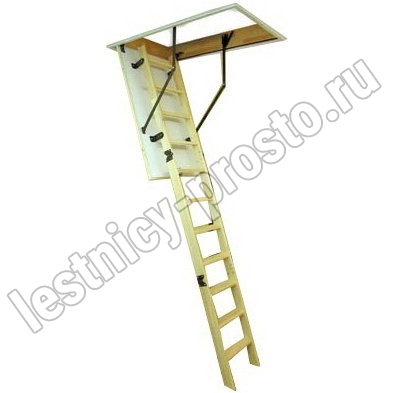 Лестница складная трёхсекционная, изготовлена из сосны. Термоизоляционная крышка типа "сэндвич" утеплена пенопластом, облицована с двух сторон ДСП белого цвета. Короб люка с однослойным уплотнителем. Все металлические элементы лестницы покрыты порошковой краской, ступени лестницы имеют антискользящие насечки и закреплены в столярное соединение «ласточкин хвост», что позволяет выдерживать нагрузку  до 150 кг. Деревянный стержень для открывания лестницы в комплекте.