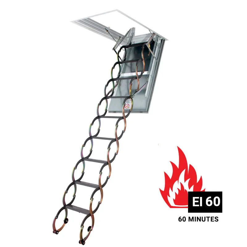 Лестница складная трехсекционная. Рабочая поверхность полностью выполнена из металла и покрашена порошковой краской. Термоизоляционная крышка типа "сэндвич", толщиной 47 мм, утеплена пенопластом, облицована с двух сторон ДCП белого цвета.
