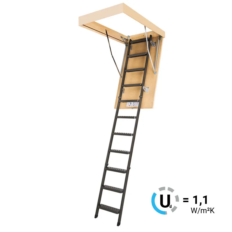 Все элементы лестницы выполнены из экологически чистых материалов и обработаны веществами, не содержащими тяжелых металлов. На ступенях антискользящие насечки. Короб лестницы изготовлен из металла. Термоизоляционная крышка типа "сэндвич" утеплена пенопластом, облицована с двух сторон ДСП белого цвета. Короб люка с уплотнителем. В комплекте деревянный стержень для открывания лестницы.