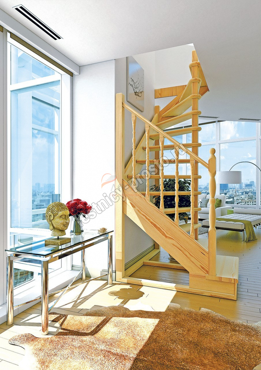 Удобная поворотная лестница на второй этаж. Дополнительные ограждения по первому маршу обеспечивают безопасность при подъеме и спуске, кроме того, небольшой угол подъема открывает всю площадь ступеней. Монтаж осуществляется силами двух человек на объекте по указаниям, приведенным в паспорте на лестницу.
