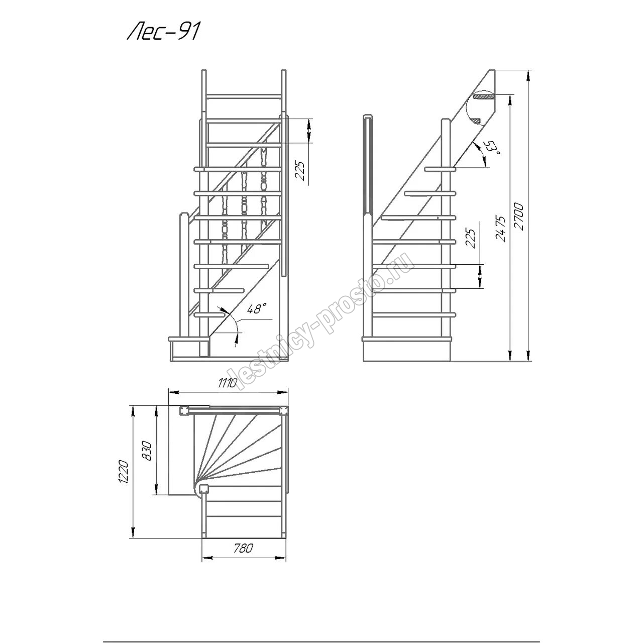 Деревянная межэтажная лестница ЛЕС-91 2475-2700 проем 1220-800, Лиственница