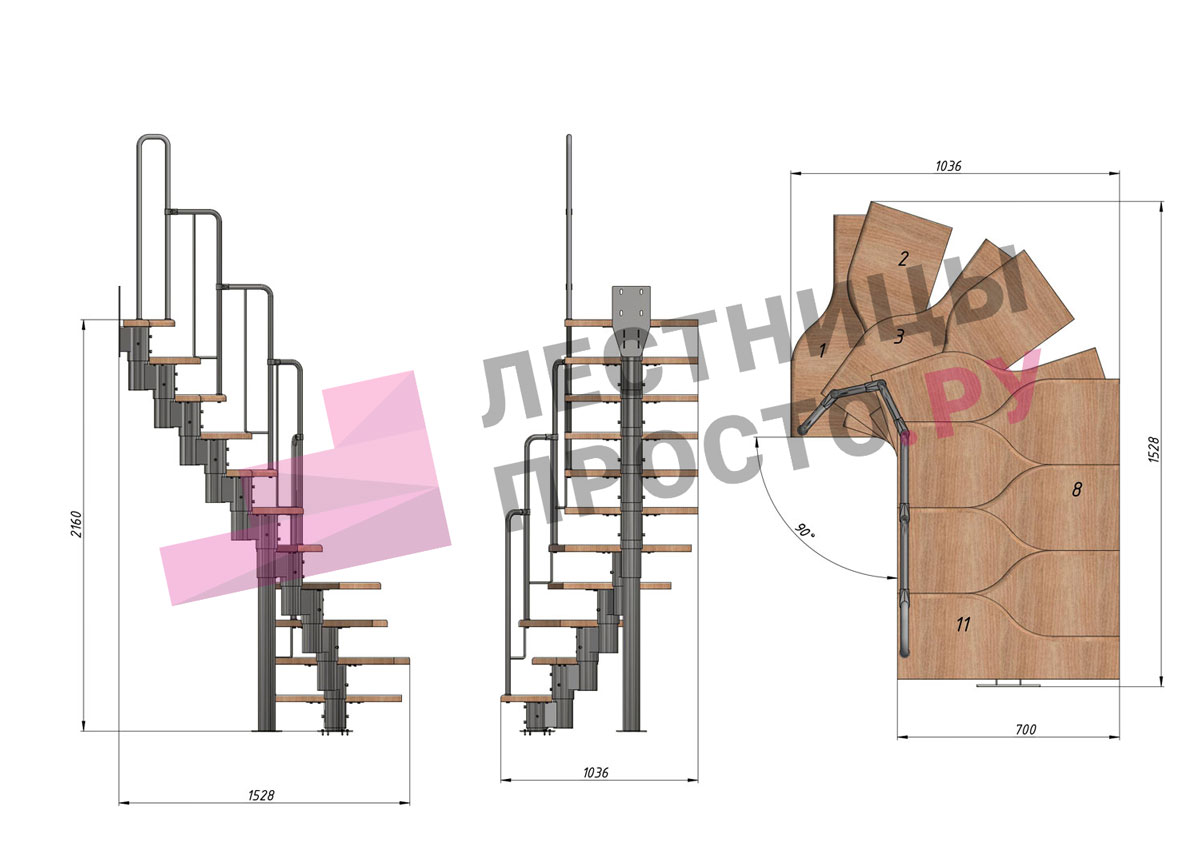 Лестница Prosto Urban Black гусиный шаг 700 мм, h198-288 см (11 ступеней), ясень