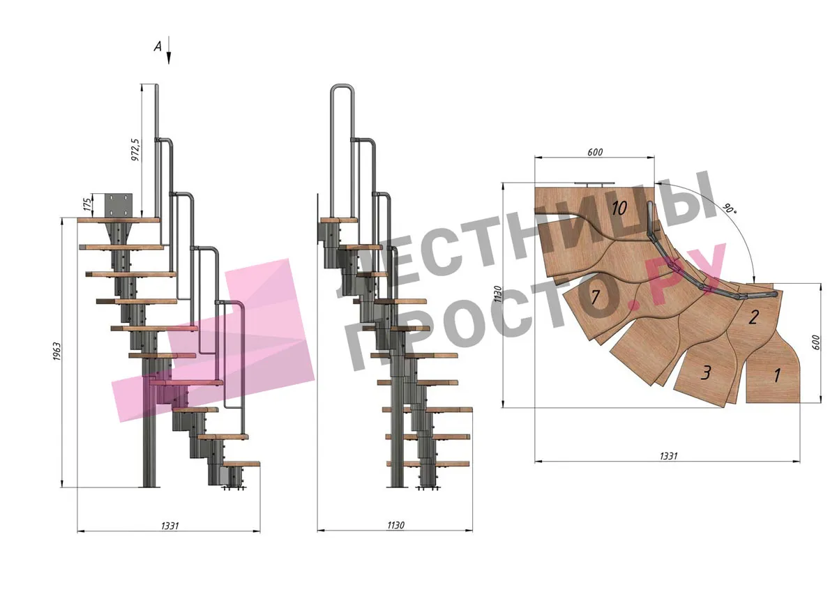 Лестница Prosto Urban Black гусиный шаг 600 мм, h180-264 см (10 ступеней), бук
