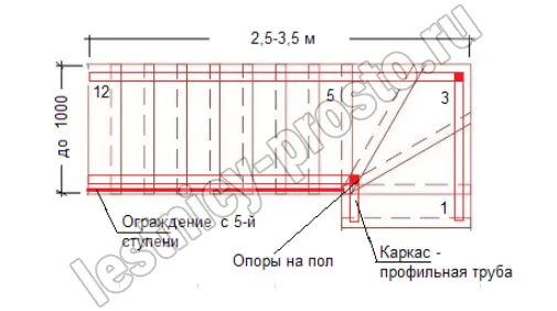 В основе конструкции лестницы PROSTO Double усиленный каркас из профильной трубы 50×100 мм, представляющий собой 2 параллельных цельносварных косоура с двумя опорами на пол под поворотом.