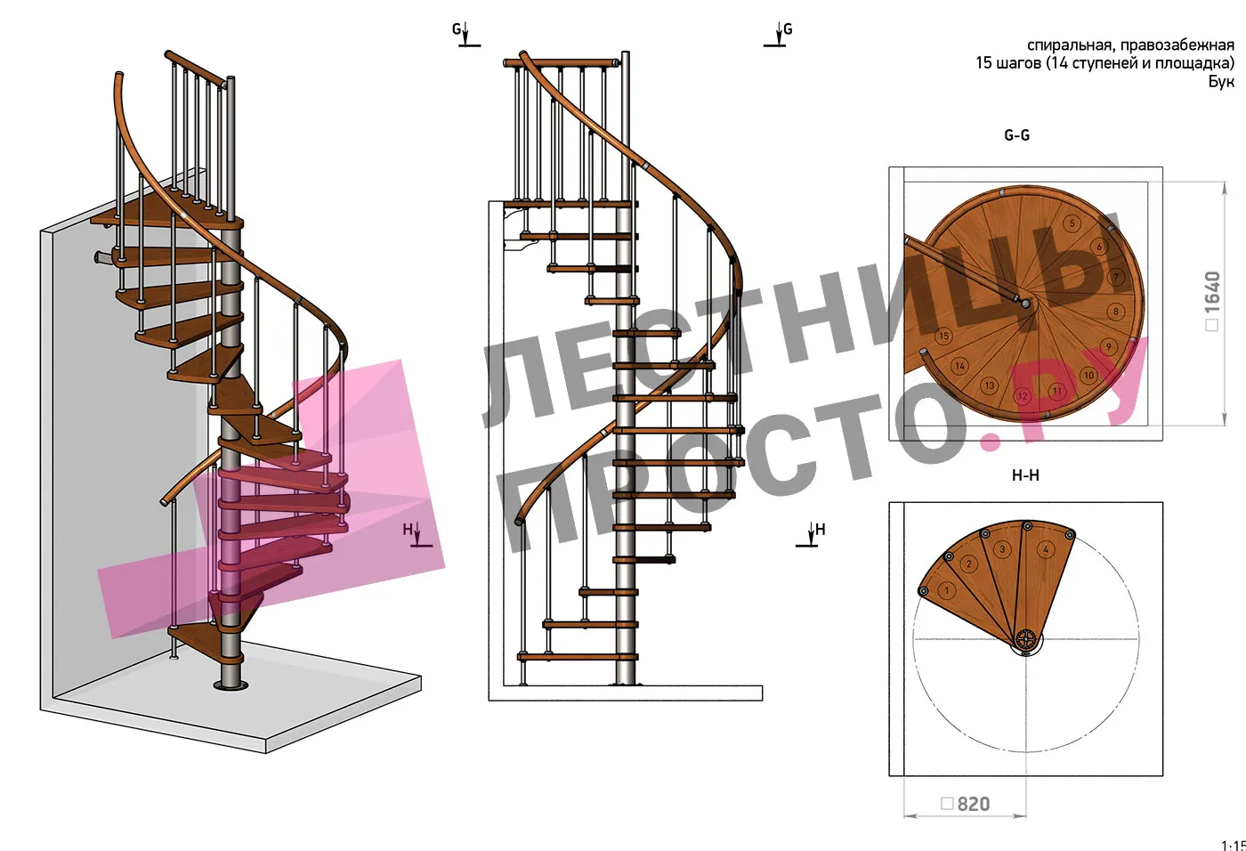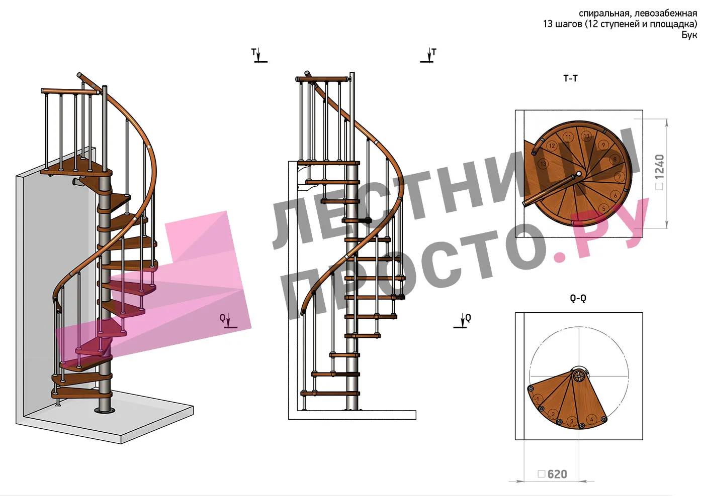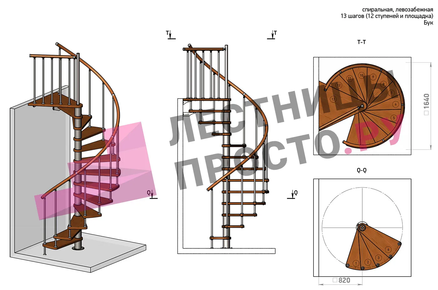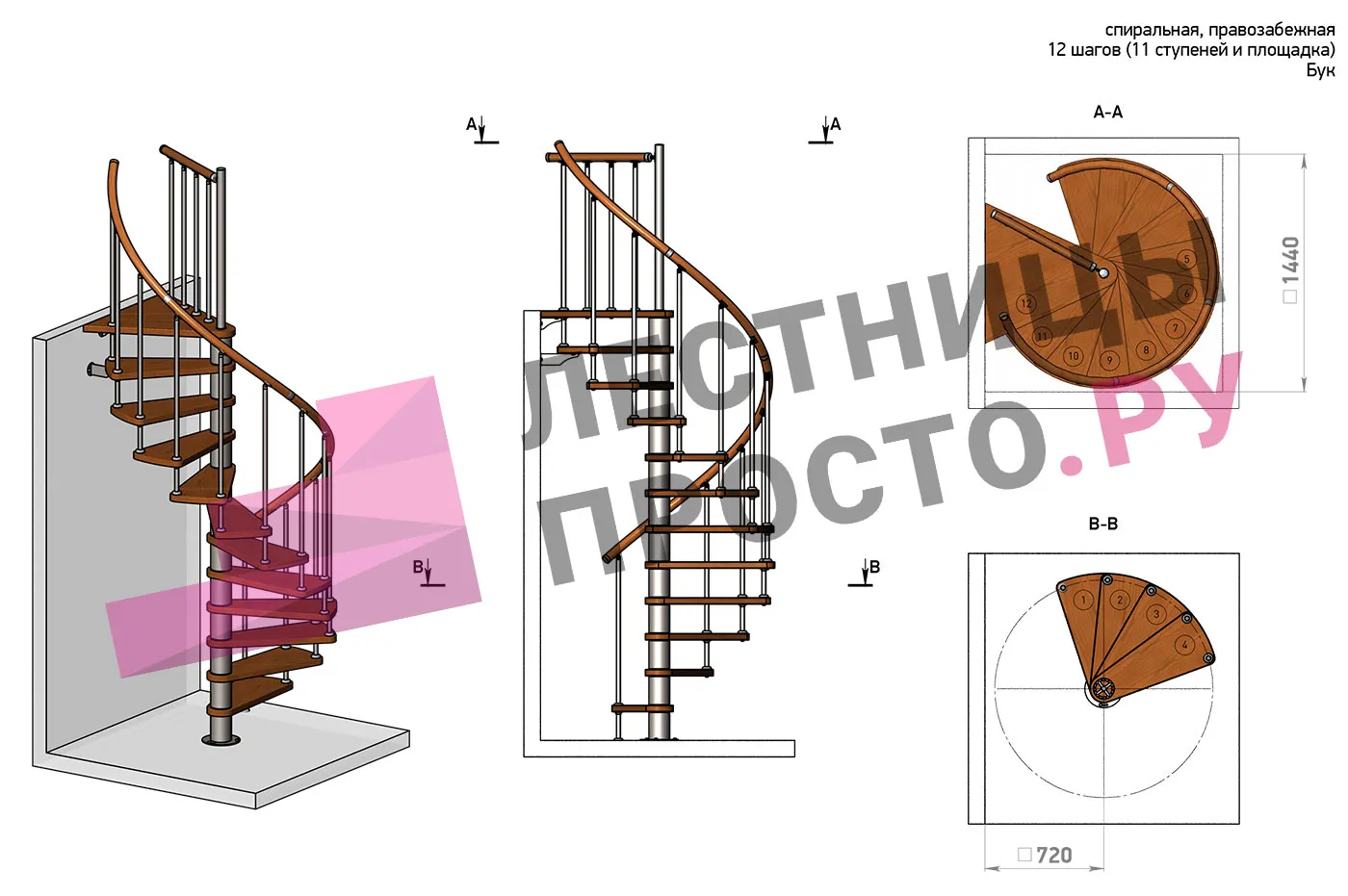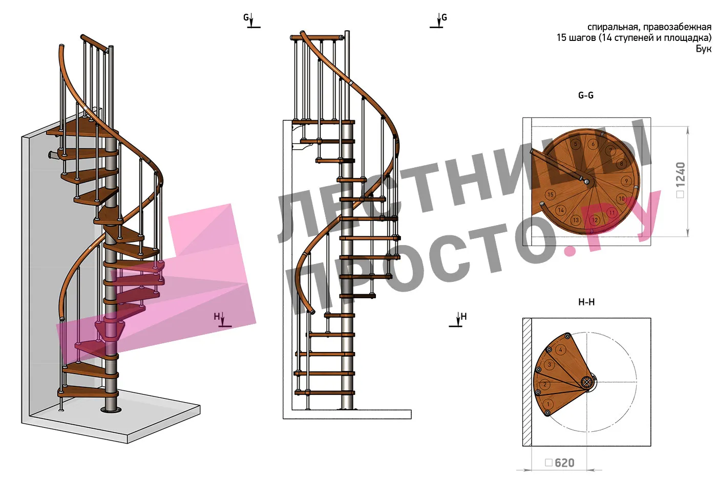 | Винтовая лестница Prosto Spiral White D160см, h325.7-369.8 см, бук |